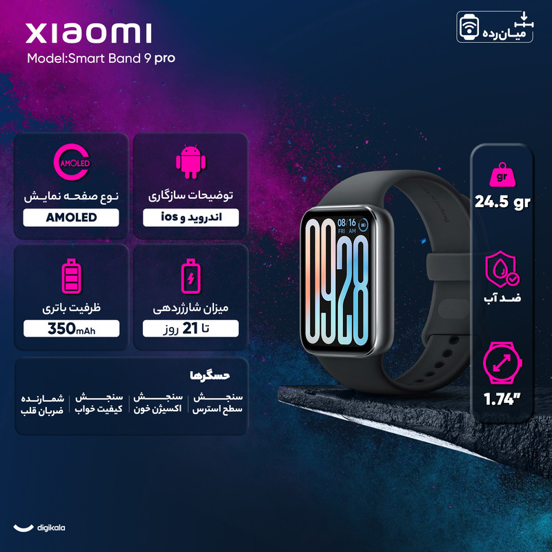 + موارد بیشترساعت هوشمند شیائومی مدل Smart Band 9 Pro یکی از جدیدترین محصولات این برند است که با طراحی ظریف، امکانات پیشرفته و عملکرد بهینه، گزینهای مناسب برای کاربری روزمره و ورزشی به شمار میرود. این ساعت با وزن سبک 24.5 گرم و بدنهای از جنس آلومینیوم همراه با بند TPU، بهراحتی روی مچ دست قرار گرفته و برای استفاده طولانی مدت، فوقالعاده عمل میکند. صفحه نمایش 1.74 اینچی AMOLED با رزولوشن 336x480 پیکسل و تراکم 336 پیکسل بر اینچ، تصاویری شفاف و پر جزئیات را به نمایش میگذارد. روشنایی 1200 نیت صفحه نمایش، باعث شده خوانایی اطلاعات نمایش داده شده روی صفحه نمایش، حتی زیر نور مستقیم خورشید، مختل نشود. با نرخ تازهسازی 60 هرتز، تجربهای روان از کار با این ساعت هوشمند را به ارمغان میآورد. Smart Band 9 Pro به مجموعهای از حسگرهای کاربردی مجهز شده است. قابلیت کنترل سطح اکسیژن خون (SPO2)، شمارش ضربان قلب و پایش وضعیت خواب، این ساعت را به یک همراه سلامت ایدهآل تبدیل کرده است. همچنین، برای ورزشکاران، 150 حالت ورزشی همراه با فناوریهای مکانیابی پیشرفته GPS، GLONASS، Galileo و QZSS، ثبت دقیق مسیرها و فعالیتهای ورزشی را فراهم میکند. باتری قدرتمند350 میلیآمپری Smart Band 9 Pro هم با یکبار شارژ میتواند در استفاده معمول تا 21 روز دوام بیاورد و تنها در 75 دقیقه بهطور کامل شارژ میشود. علاوه بر این، ضد آب بودن تا عمق 50 متر و اتصال بلوتوث نسخه 5.4، کارایی این ساعت را در فعالیتهای روزمره و ورزشی تکمیل میکند. سازگاری با اندروید 8 و iOS 12 به بالا، امکان اتصال به طیف وسیعی از دستگاههای هوشمند را فراهم کرده است.