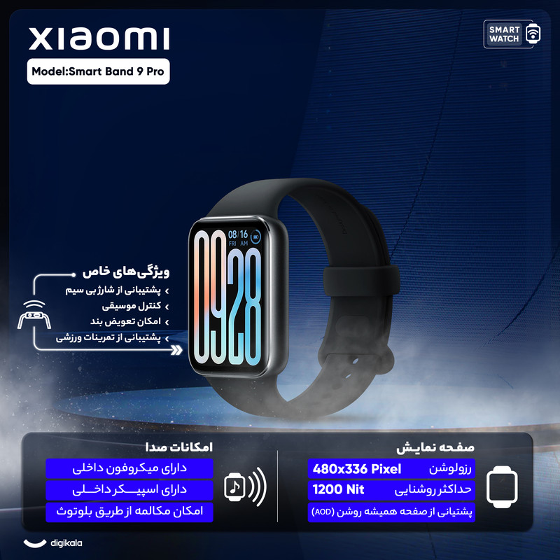 ساعت هوشمند 44 میلیمتری شیائومی مدل Smart Band 9 Pro، مناسب برای ورزش، کنترل سطح اکسیژن خون، شمارش ضربان قلب، پایش وضعیت خواب، با بند پلاستیکی